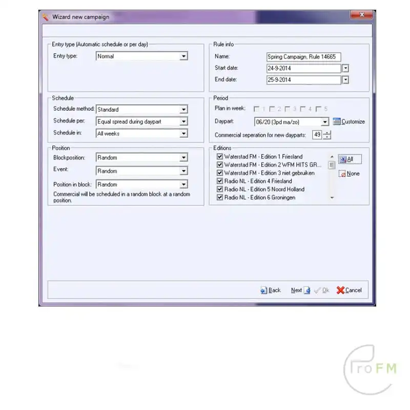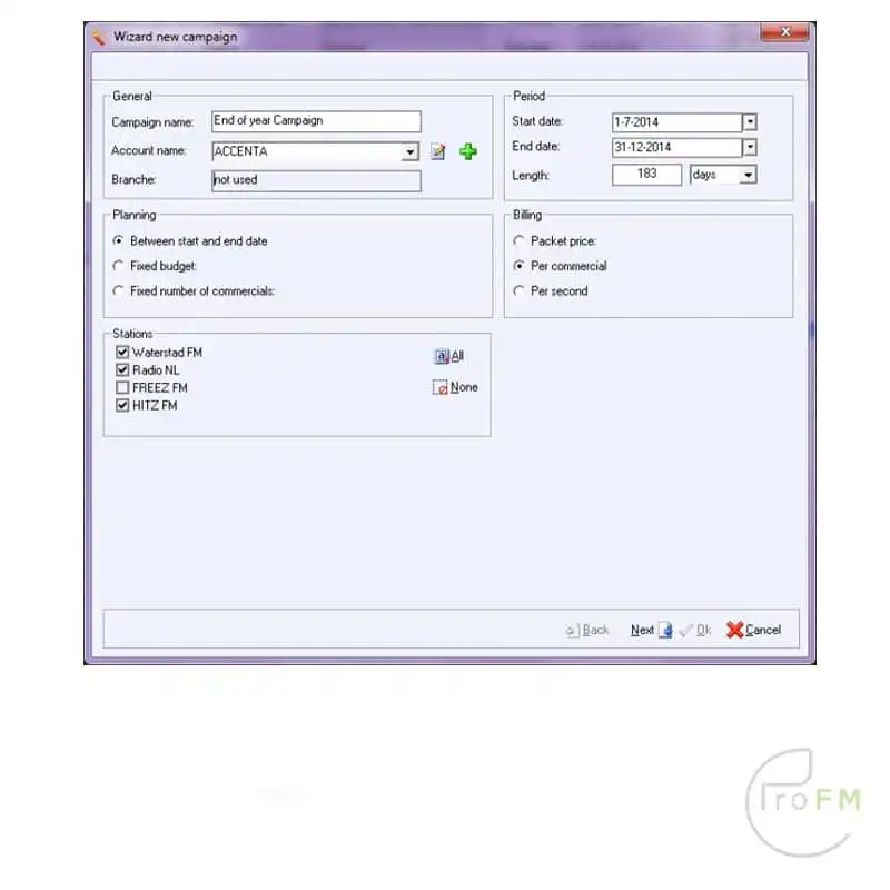 Met de wizard kun je eenvoudig en snel een nieuwe campagne opzetten. In een paar eenvoudige stappen kunnen de basisgegevens worden ingevoerd in de wizard. Je kunt ook gegevens opnemen die nodig zijn voor de facturering aan je klanten. De wizard kan ook worden gebruikt om meerdere herinneringen aan elke commercial toe te voegen.