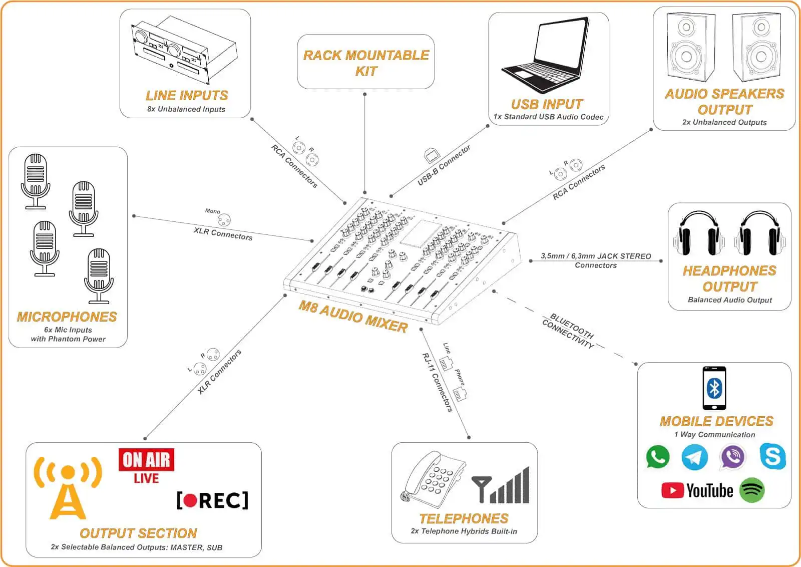 De nieuwe compacte M8 is een zeer veelzijdige radio mixer die geschikt is voor on-air en productiestudio’s en ontworpen is voor alle soorten radio omgevingen. De M8 console wordt geleverd als een uniek en gebruiksklaar stukje hardware met alle belangrijke functies zoals USB, Bluetooth en 2 telefoon hybrides. Deze compacte mengtafel heeft ook de bedieningselementen Talk Back, Control Room Mute en On-Air.