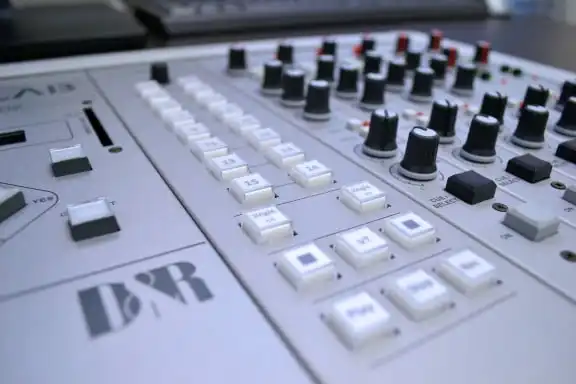 De tweede “”modulesectie”” herbergt de Talk back niveauregeling voor de electret microfoon en de Studio sectie, meestal gebruikt om de PROGRAM uitgang te monitoren, met de mogelijkheid om te schakelen naar van Air, van SUB of het Control Room Monitor signaal. Als de studiomicrofoon open is, is de studio-uitgang gedempt, aangegeven door de studio MUTE LED. De studio-uitgang is voorzien van een Talk-back schakelaar Communicatie is erg belangrijk in omroepstudio’s, dus besloten we voor drie aparte uitgangen te gaan. Eén voor Studio, één voor Gasten) en één voor de Omroeper. Alle uitgangen ontvangen hetzelfde signaal dat geselecteerd is door de ingangskeuzeschakelaars, of het uitgangssignaal van het Programma als er geen schakelaar geactiveerd is. De Studio-uitgang heeft een mute LED-indicator wanneer de uitgang is gedempt. Alle drie de uitgangen hebben een directe Talk back-toegangsschakelaar voor directe communicatie tussen de controlekamer en de presentatieruimte. De Cue-bus is de belangrijkste communicatiebus in de console. Wanneer een luisteraar naar het station belt, kun je hem of haar door op de Cue-schakelaar van de Telco-module te drukken direct op de monitoren van de controlekamer krijgen. Tegelijkertijd wordt de interne electretmicrofoon geactiveerd zodat je meteen kunt reageren. De omroeper kan zijn communicatieknop op afstand indrukken en is verbonden met dezelfde Cue-bus, dus jullie drieën praten met elkaar. De AIRLAB heeft vier VU-meters waarvan er altijd twee zijn aangesloten op de hoofduitgangen en de andere twee alles volgen wat er op het CRM te horen is.