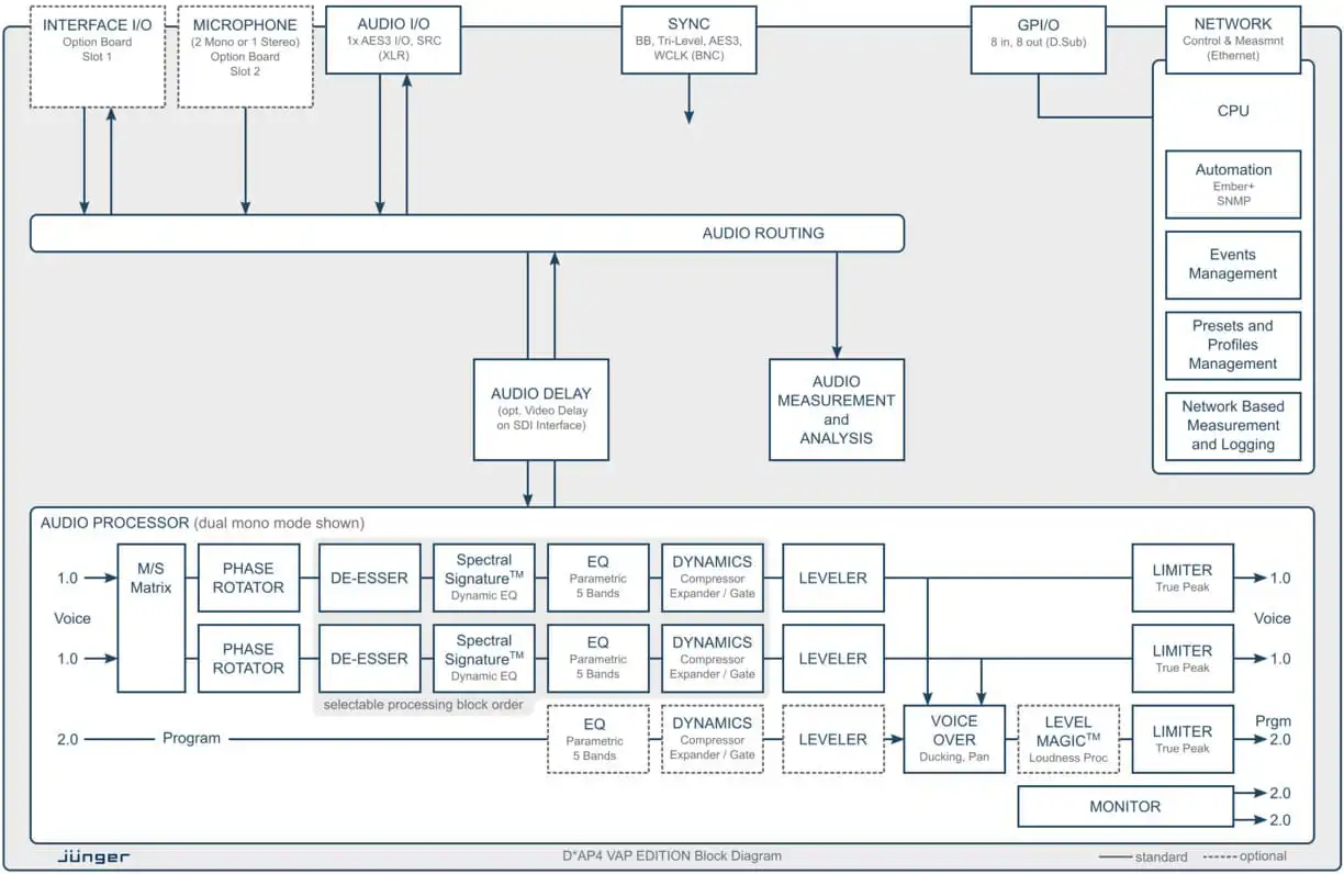 Audio I/O’s variëren van native AES/EBU aan boord tot optionele 3G SDI inclusief video delay, MADI, Dante® audio over IP, analoge en hoogwaardige microfoonvoorversterkers. Standaard zijn er bypass-relais voor stroomuitval en met de dubbele redundante PSU’s en SNMP-integratie zorgt de unit voor maximale operationele veiligheid en gemoedsrust voor de huidige kritieke 24/7 radio- en tv-uitzendingen of audioproductiefaciliteiten.