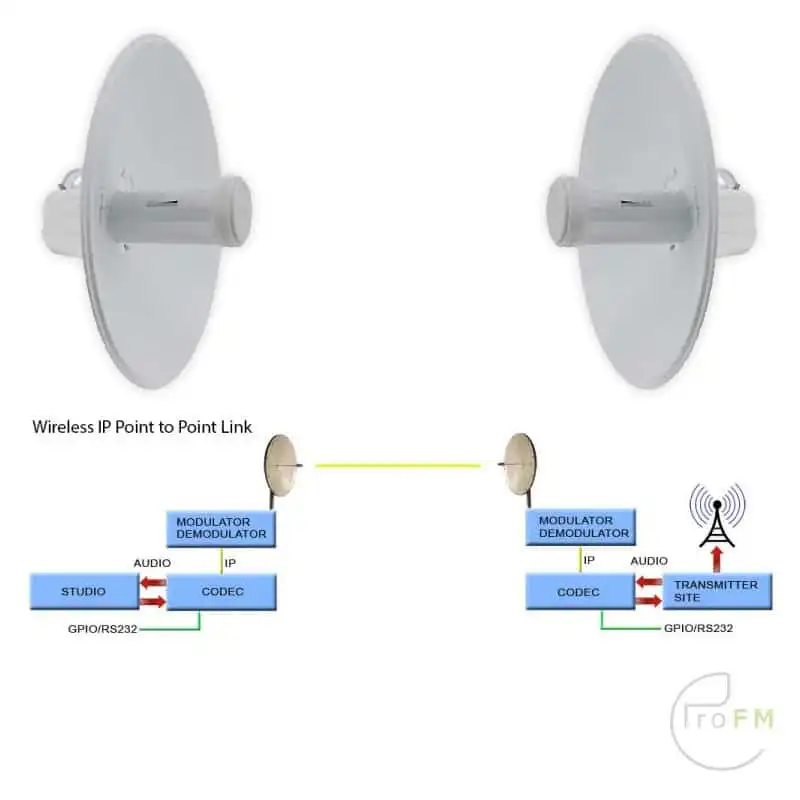Met deze combinatie set creeer je een digitale studio naar zender verbinding waarmee je via analoge of digitale audio in -audio uit principe gaat werken. Plaats op de zender locatie dan uw audio processor, stereo/rds encoder.Dit pakket bevat alles wat je nodig hebt om aan de slag te gaan. Het enige dat je moet leveren is een zichtlijn tussen punt A en punt B. Je kunt zonder problemen afstanden van 15-25 km verwachten met een doorvoer van 150 Mbps (zichtlijn).
